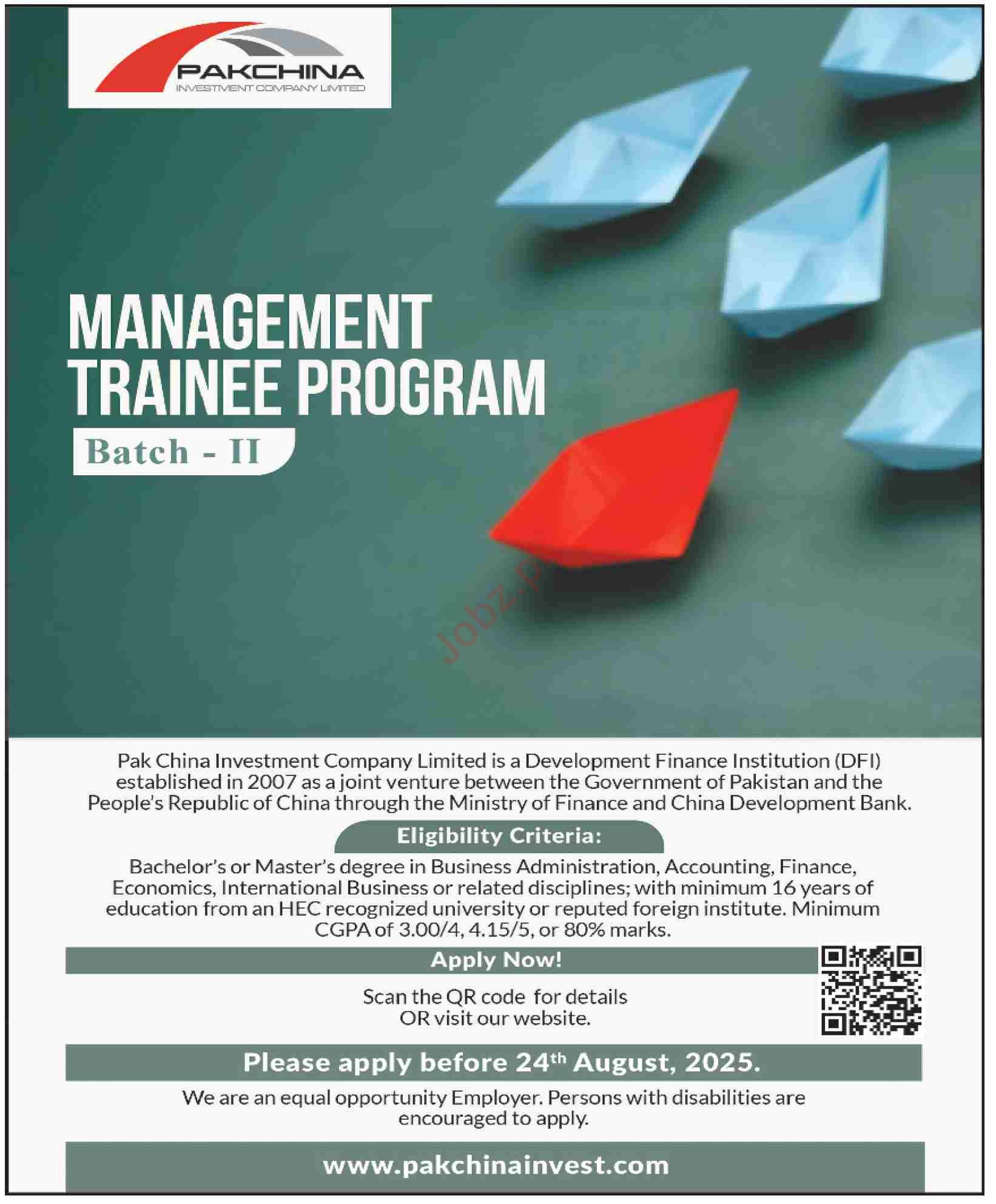 Pak China Investment Company Limited Karachi, karachi Sindh Pakistan invites applications from eligible candidates for the post of management trainee program as per advertisement of August 10, 2025 published in daily Dawn Newspaper. Candidates with Bachelor and Master etc. educational background will be preferred.