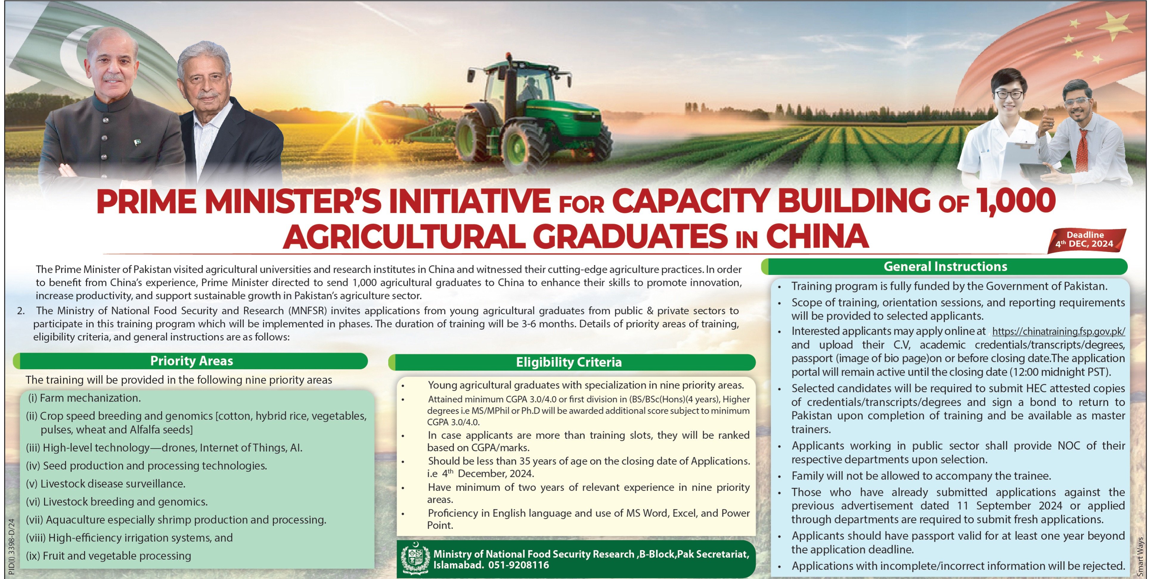 Ministry of National Food Security & Research MNFSR latest Government Management jobs and others can be applied till December 4, 2024 or as per closing date in newspaper ad. Read complete ad online to know how to apply on latest Ministry of National Food Security & Research MNFSR job opportunities.