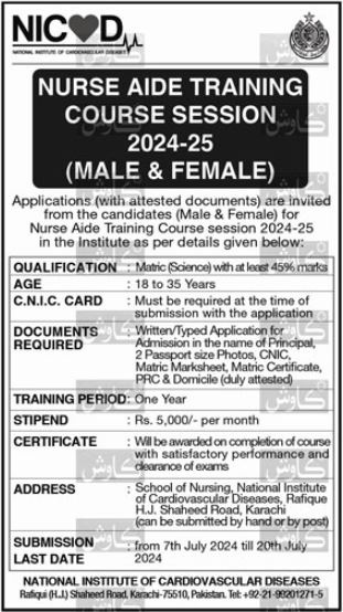Vacant posts including nurse aide training are announced in National Institute of Cardiovascular Diseases NICVD Karachi, karachi Sindh Pakistan as per 8 July 2024 advertisement in daily Kawish Newspaper. Matric etc. educational qualification will be preferred.