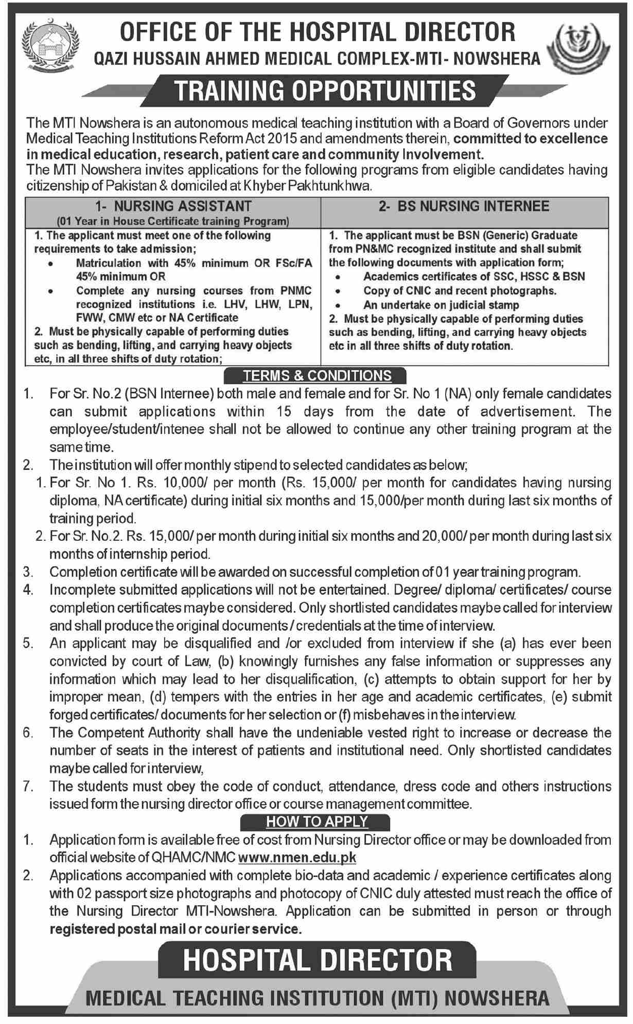 Medical Teaching Institution MTI jobs advertisement dated about 23 August 2024 in daily Dawn Newspaper invites application for the vacant post of nursing assistant and nursing internee in Nowshera, nowshera Khyber Pakhtunkhwa KPK Pakistan. Matric and Others etc. educational qualification will be preferred.