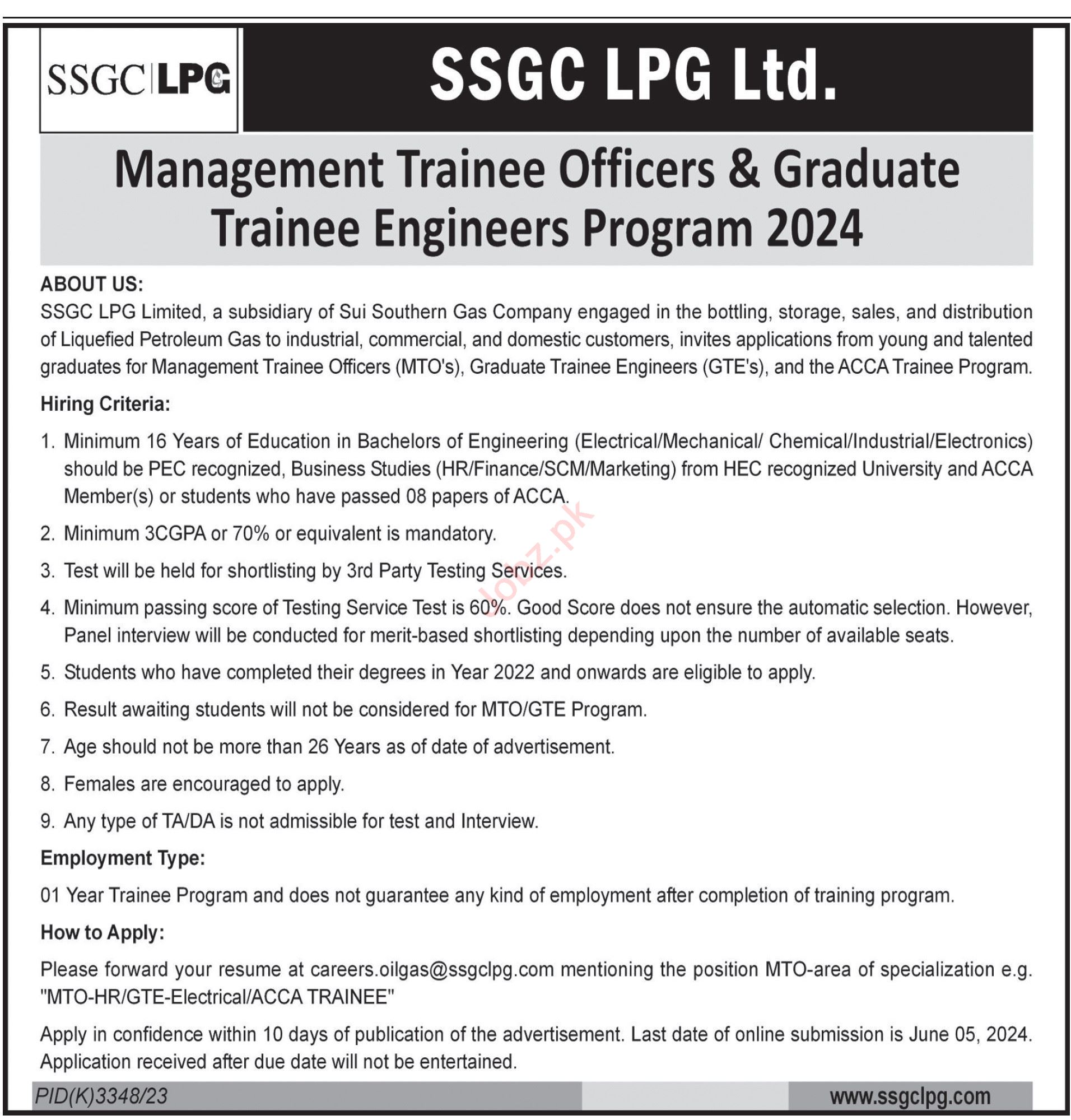 SSGC LPG Pvt Limited Karachi, karachi Sindh Pakistan invites applications from eligible candidates for the post of management trainee officer and graduate trainee engineer as per advertisement of May 26, 2024 published in daily Express Tribune Newspaper. Educational qualifications required Master and Bachelor etc.
