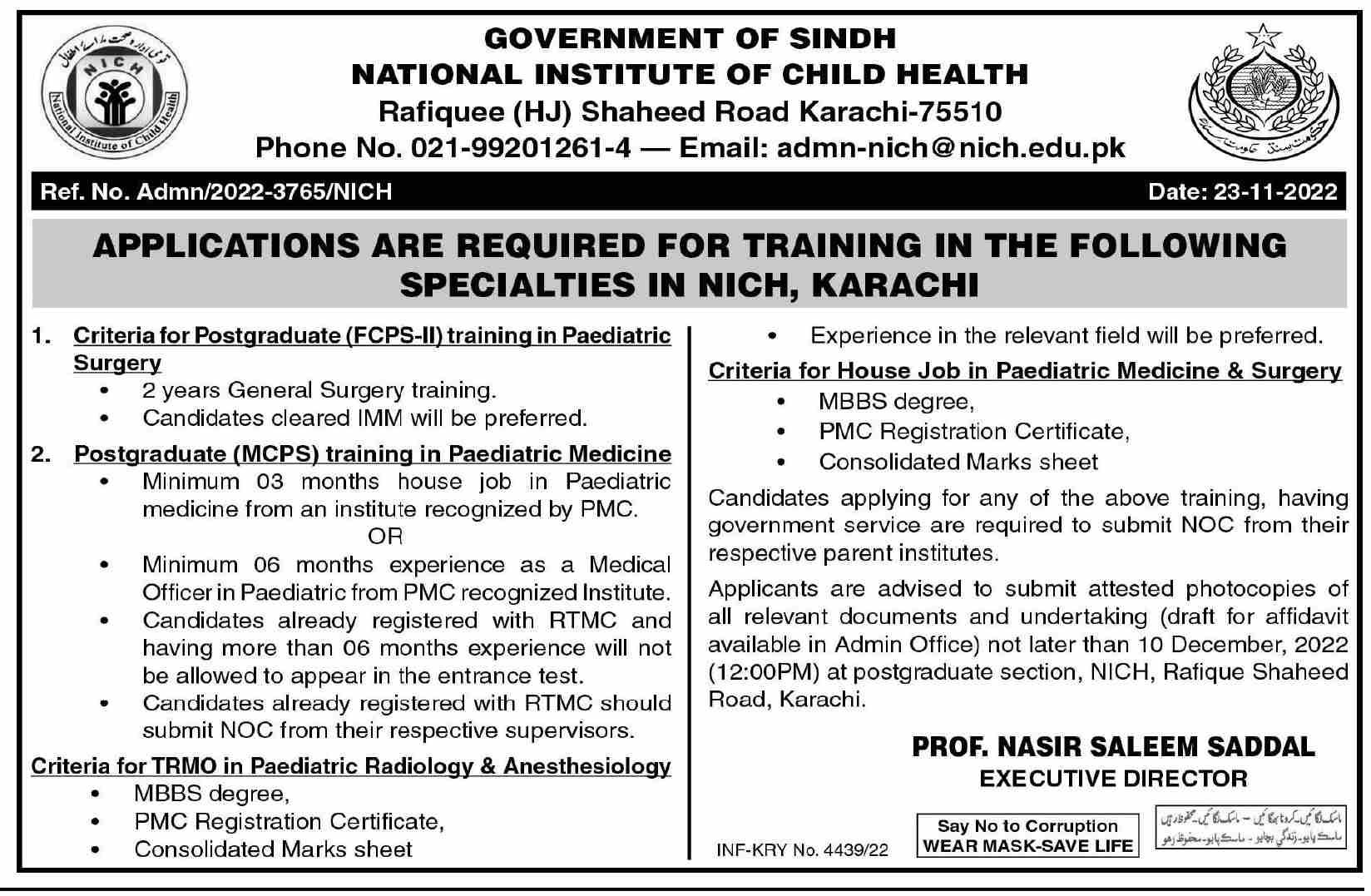 National Institute of Child Health jobs advertisement dated about 25 November 2022 in daily Dawn Newspaper invites application for the vacant post of mcps training in paediatric medicine, house job in paediatric medicine surgery, postgraduate fcps ii training in paediatric surgery and trmo in paediatric radiology anesthesiology in Karachi, karachi Sindh Pakistan. Educational qualifications required MBBS and Others etc.