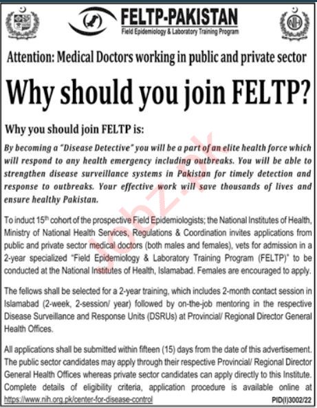 National Institute of Health NIH Karachi, karachi Sindh Pakistan invites applications from eligible candidates for the post of field epidermologist laboratory training program as per advertisement of November 13, 2022 published in daily Jang Newspaper. Educational qualifications required Others and MBBS etc.