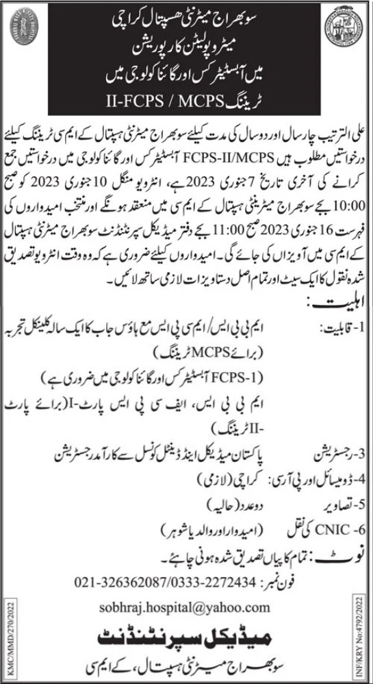 Sobhraj Maternity Hospital jobs advertisement dated about 26 December 2022 in daily Jang Newspaper invites application for the vacant post of fcps ii trainee obstetrics gynaecology and mcps trainee obstetrics gynaecology in Karachi, karachi Sindh Pakistan. Persons with MBBS and Others etc. education can apply.