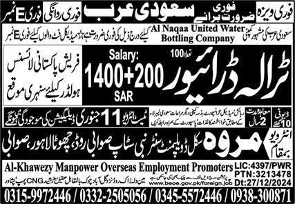 Al Khawezy Overseas Employment Promoters jobs advertisement dated about 7 January 2025 in daily Express Newspaper invites application for the vacant post of trala driver in Riyadh, riyadh Saudi Arabia. Persons with Middle etc. education can apply.