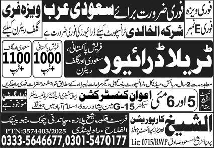 Al Sheikh Corporation latest Overseas Driving jobs and others can be applied till May 6, 2025 or as per closing date in newspaper ad. Read complete ad online to know how to apply on latest Al Sheikh Corporation job opportunities. Extra hours work allowed to earn more. On job medical, transport and accommodation facility is provided.