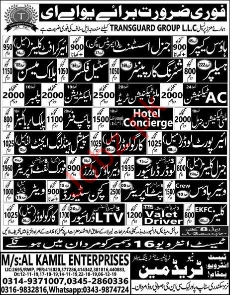 A large and well established Transguard Group LLC is looking for experienced and responsible persons for the posts of Housekeeper, General Assistant, Aircraft Cleaner, Helper, Shuttering Carpenter, Steel Fixer, Block Mason, AC Technician, Electrician, Plumber, Pipe Fitter, Public Area Cleaner, Airport Loader, Cargo Loader, Fork Lift Operator, Loader Driver, Warehouse Worker, General Cleaner, Waiter, Valet Driver, LTV Driver and Cleaner in United Arab Emirates UAE 2020.