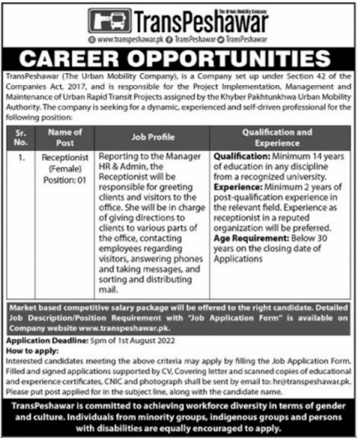 TransPeshawar latest Government Management jobs and others can be applied till August 1, 2022 or as per closing date in newspaper ad. Read complete ad online to know how to apply on latest TransPeshawar job opportunities.
