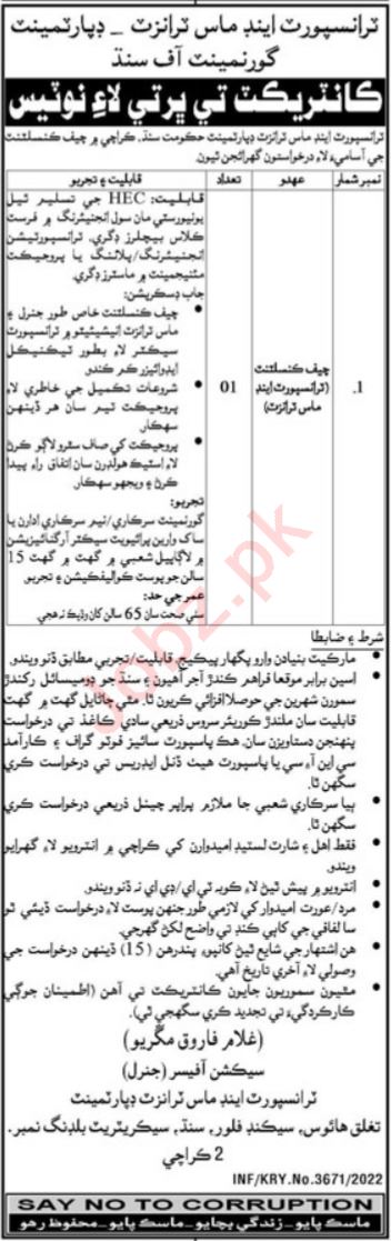 Transport & Mass Transit Department is looking for candidates for following posts as per job advertisement published in daily Kawish Newspaper of September 19, 2022 for location Karachi, karachi Sindh Pakistan: