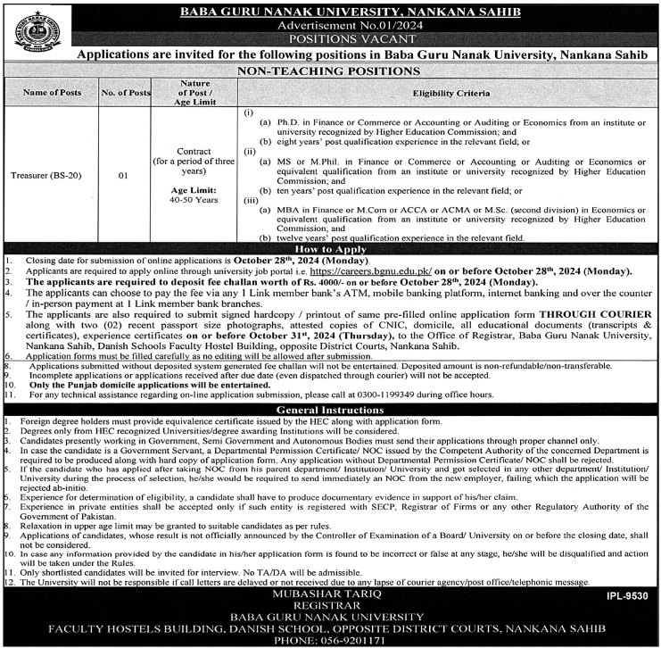 Vacant posts including treasurer are announced in Baba Guru Nanak University Nankana Sahib, nankana sahib Punjab Pakistan as per 10 October 2024 advertisement in daily Express Tribune Newspaper. Preferred Education is Phd, MBA, M.com, CA and ACCA etc.