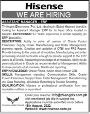 Tri Angels Company Karachi, karachi Sindh Pakistan invites applications from eligible candidates for the post of assistant manager erp and assistant manager as per advertisement of August 7, 2022 published in daily Jang Newspaper. Persons with Master and Bachelor etc. education can apply.
