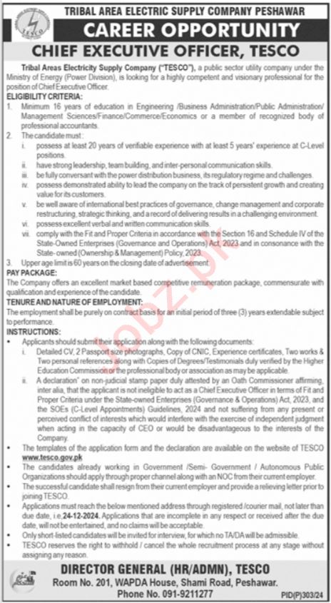 Tribal Areas Electricity Supply Company TESCO invites applications for job positions advertised in daily Jang dated 8 December 2024 for following vacancies in Peshawar, peshawar Khyber Pakhtunkhwa KPK Pakistan.