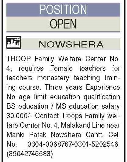 Troops Family Welfare Center TWFC jobs advertisement dated about 30 May 2023 in daily Dawn Newspaper invites application for the vacant post of female teacher, montessori trained teacher and teacher in Nowshera, nowshera Khyber Pakhtunkhwa KPK Pakistan. Candidates with Bachelor and Master etc. educational background will be preferred.