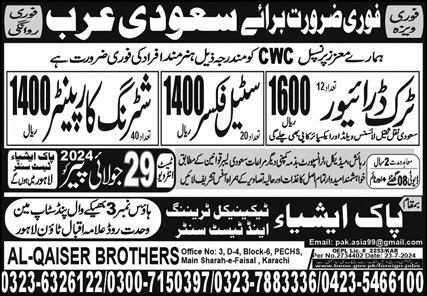 Al Qaiser Brothers invites applications for job positions advertised in daily Express dated 24 July 2024 for following vacancies in Riyadh, riyadh Saudi Arabia.