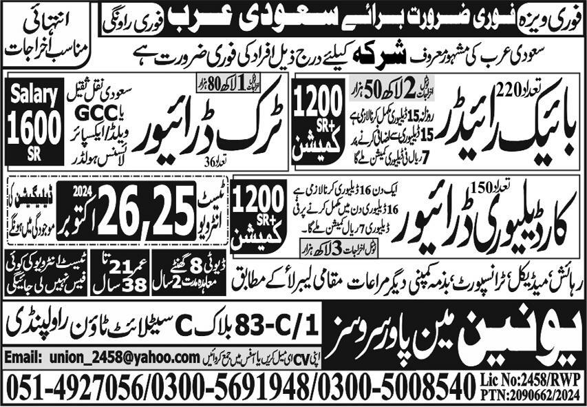Union Manpower Services latest Overseas Driving jobs and others can be applied till 26 October 2024 or as per closing date in newspaper ad. Read complete ad online to know how to apply on latest Union Manpower Services job opportunities. Salary varies from 118000. Extra hours work allowed to earn more. During job medical, transport and accommodation facility is available.