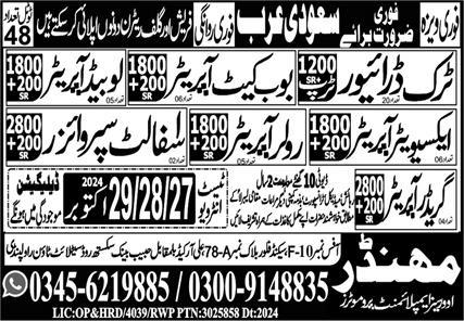 Mahender Overseas Employment Promoters Jeddah, makkah Saudi Arabia invites applications from eligible candidates for the post of truck driver, asphalt supervisor, roller operator, grader operator, low bed operator, bobcat operator, driver and excavator operator as per advertisement of October 22, 2024 published in daily Express Newspaper. Educational qualifications required DAE, Matric and Intermediate etc.