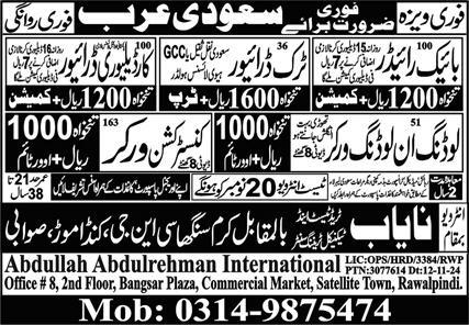 Nayab Trade Test and Technical Training Center jobs advertisement dated about 14 November 2024 in daily Express Newspaper invites application for the vacant post of car delivery driver, truck driver, rider, construction worker, bike rider, htv driver, loading unloading worker and driver in Riyadh, madina Saudi Arabia. Candidates with Intermediate, Matric and Middle etc. educational background will be preferred.