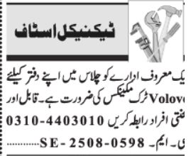 Manufacturing Company jobs advertisement dated about 20 August 2025 in daily Jang Newspaper invites application for the vacant post of mechanic and truck mechanic in Lahore, lahore Punjab Pakistan. Educational qualifications required Intermediate and Matric etc.