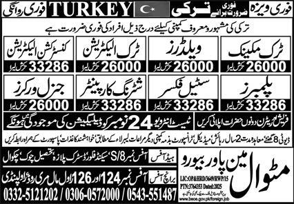 Matwal Manpower Bureau Istanbul, ankara Turkey invites applications from eligible candidates for the post of plumber, general worker, truck mechanic, steel fixer, truck electrician, welder, construction electrician and shuttering carpenter as per advertisement of November 21, 2025 published in daily Express Newspaper. Candidates with Bachelor, Matric and Intermediate etc. educational background will be preferred.