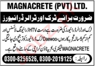 Magnacrete Pvt Limited Karachi, karachi Sindh Pakistan invites applications from eligible candidates for the post of htv driver, truck driver and tralla driver as per advertisement of October 9, 2022 published in daily Jang Newspaper. Middle and Matric etc. educational qualification will be preferred.