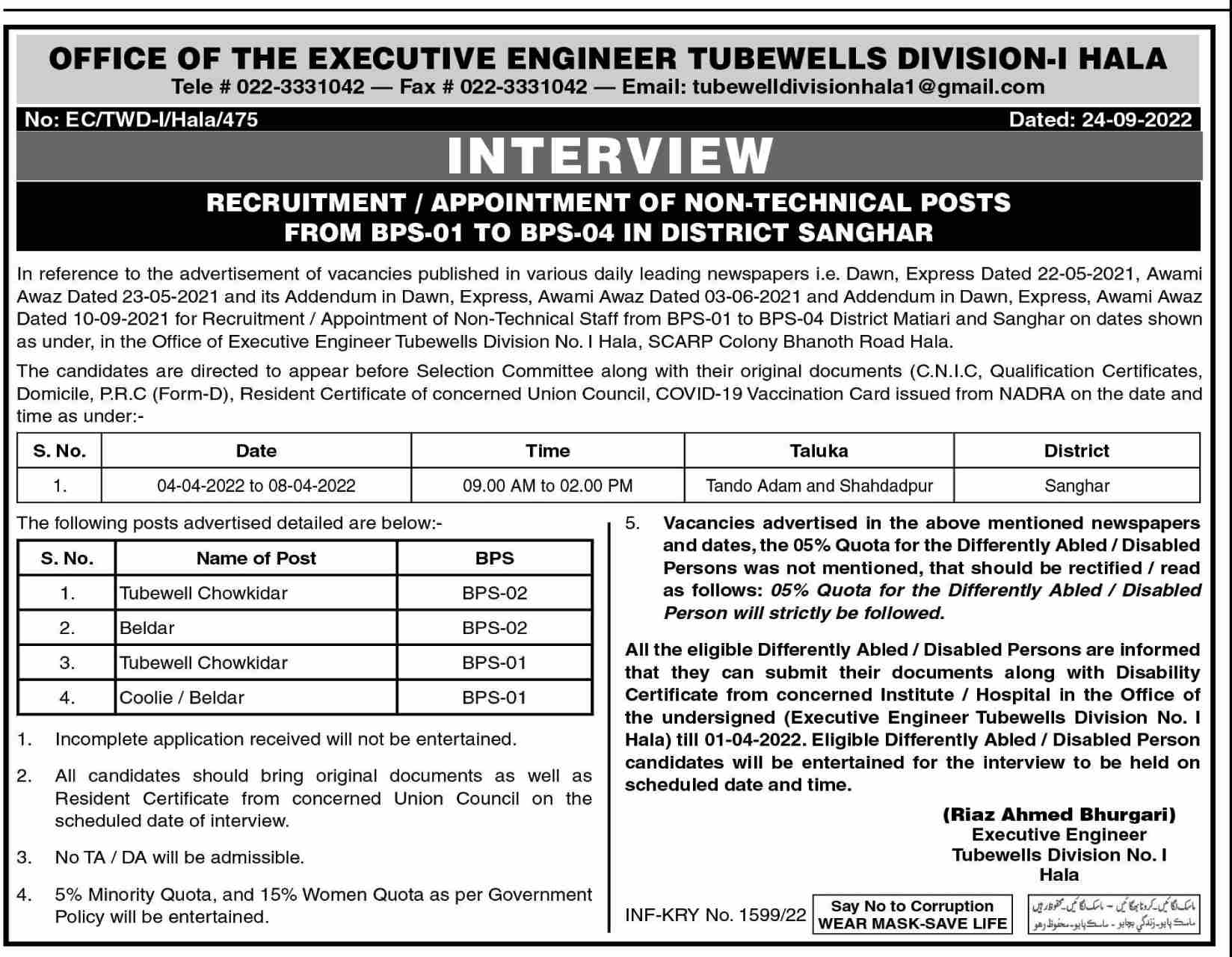 Office of the Executive Engineer Tubewells Division Hyderabad, hyderabad Sindh Pakistan invites applications from eligible candidates for the post of beldar, coolie and chowkidar as per advertisement of March 27, 2022 published in daily Dawn Newspaper. Primary and Middle etc. educational qualification will be preferred.