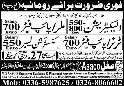 ASACO Manpower Evaluation & Placement Services jobs advertisement dated about 26 March 2024 in daily Express Newspaper invites application for the vacant post of electrician, construction labor, turner, miller and pipe fitter in Romania, romania Romania. Candidates with Bachelor, DAE, Intermediate and Matric etc. educational background will be preferred.