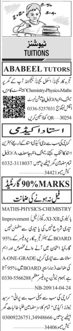 Vacant posts including chemistry teacher, commerce teacher, maths teacher and physics teacher are announced in Education Karachi, karachi Sindh Pakistan as per 14 April 2024 advertisement in daily Jang Newspaper. Master, Others and Bachelor etc. educational qualification will be preferred.