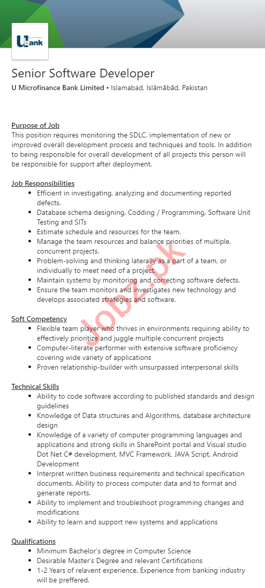 U Microfinance Bank Islamabad Jobs 2020 Software Developer