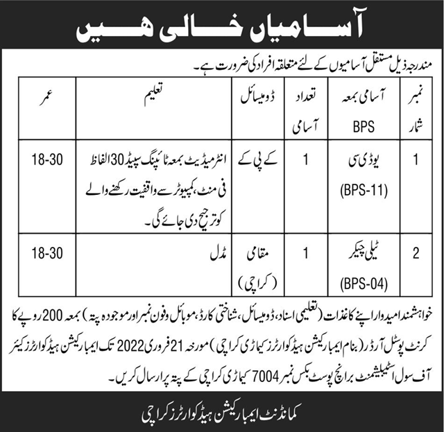 Embarkation Unit invites applications for job positions advertised in daily Nawaiwaqt dated 6 February 2022 for following vacancies in Karachi Sindh Pakistan.