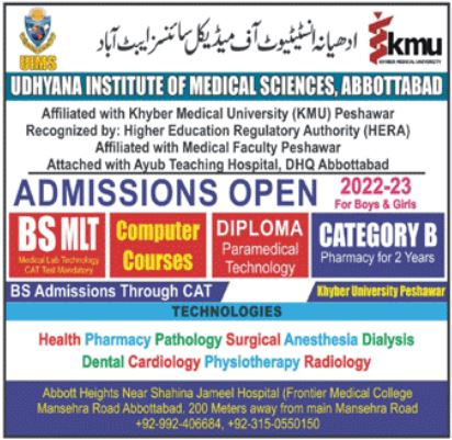 Udhyana Institute Of Medical Sciences BS MLT, Computer Courses, Paramedical Diploma, Pharmacy Category B. admissions 2022 has been started. Eligible students can apply for academic admissions 2022 in Udhyana Institute Of Medical Sciences Mansehra Khyber Pakhtunkhwa KPK Pakistan for Medical Course. Eligible candidates for admissions in Pharm D and Course can apply as per Private institute criteria and before closing date after reading advertisement online. Read newspaper ad for exact details.