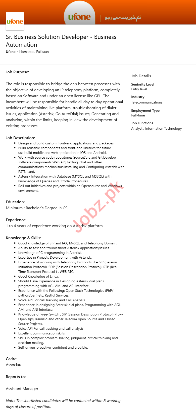 Ufone Islamabad Jobs 2020 Senior Business Solution Developer