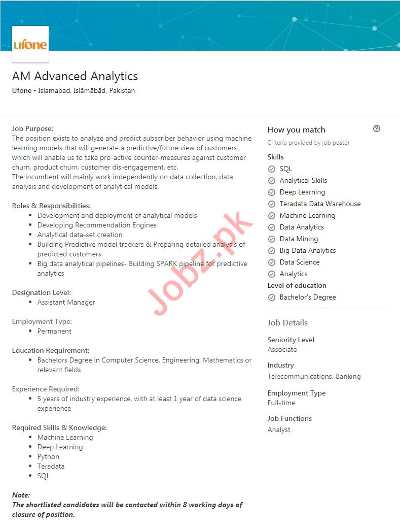 Ufone Islamabad Jobs For AM Advanced Analytics
