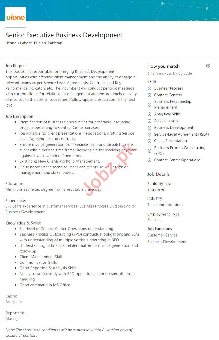 Ufone Lahore Jobs 2020 Senior Executive Business Development