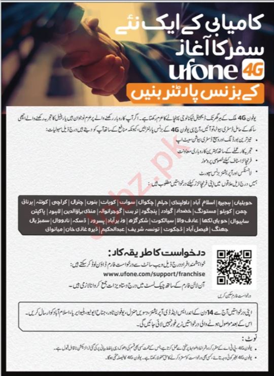 Ufone Mobile Operator Company Karachi, karachi Sindh Pakistan invites applications from eligible candidates for the post of franchiser as per advertisement of November 3, 2024 published in daily Jang Newspaper. Educational qualifications required Master, MS and Bachelor etc.