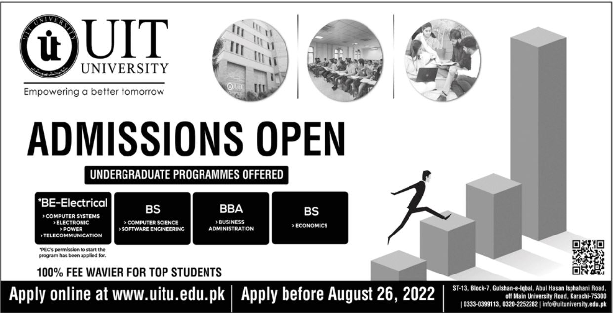 Admissions in Usman Institute of Technology UIT 2022 for BE Electrical Engineering, Computer Systems Engineering, Electronics Engineering, Power Engineering, Telecommunication Engineering, BS in Computer Science BSCS, Software Engineering, BBA Business Administration, BS in Economics has been announced. Eligible students who qualify as per admission criteria in Usman Institute of Technology UIT Karachi Sindh Pakistan can apply in Science University for academic year 2022. Students for admissions in BBA, B.E and BS can apply for online or campus classes as per Private institute criteria till admission closing date July 20, 2022. Read newspaper ad for exact details.