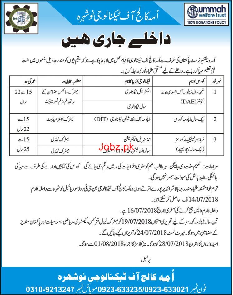 Ummah College of Technology Admission in Diploma of Associate Engineer DAE, One year Diploma Courses and Trade Certificate Courses in Nowshera. Last date is 16-07-2018. Read newspaper ad for exact details.