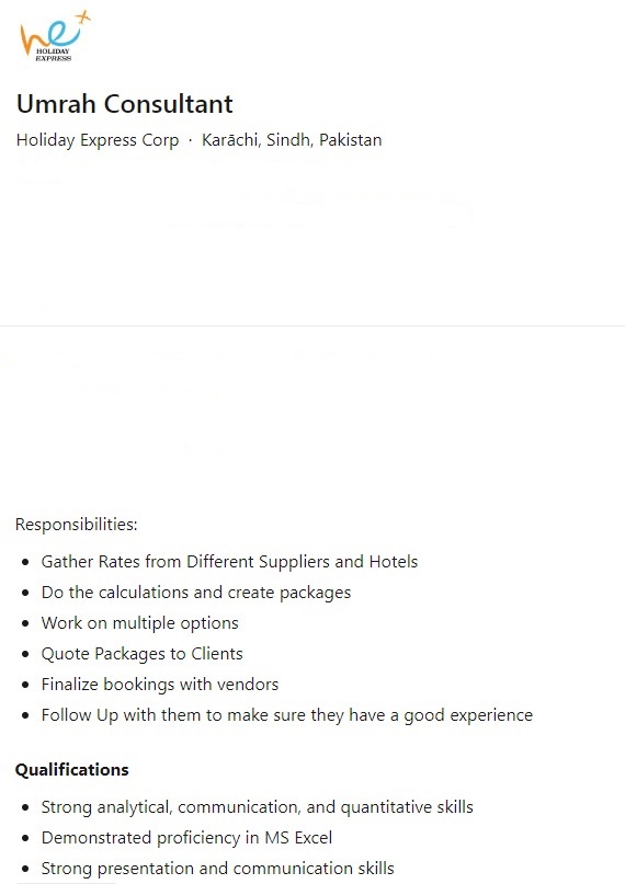 Holiday Express Corp jobs advertisement dated about 20 January 2023 in daily Other Newspaper invites application for the vacant post of umrah consultant in Karachi, karachi Sindh Pakistan. Persons with Bachelor and Master etc. education can apply.