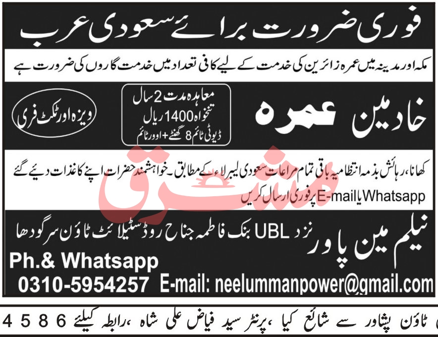 Vacant posts including umrah servant are announced in Neelum Manpower Makkah, makkah and madina Saudi Arabia as per 3 August 2023 advertisement in daily Mashriq Newspaper. Candidates with Matric and Intermediate etc. educational background will be preferred.