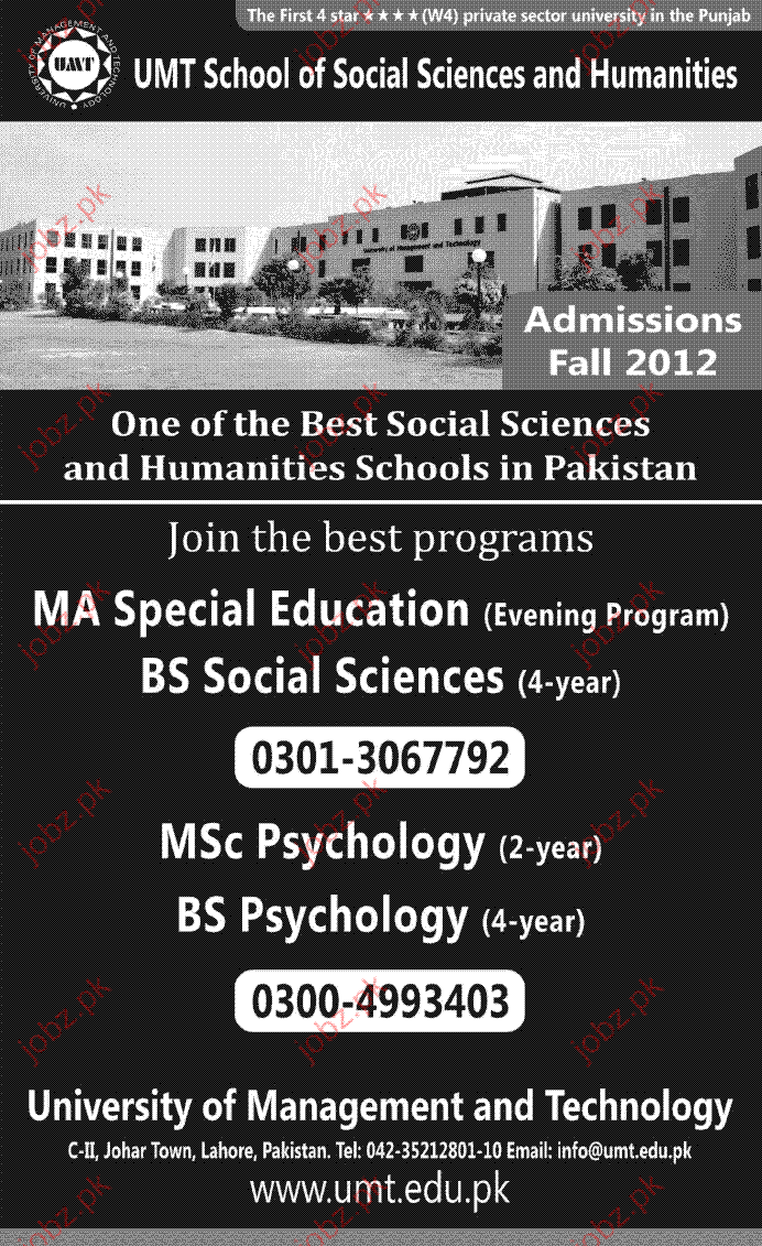 MA Social Education, BS Social Sciences Admission Open in UMT School of Social Sciences and Humanities. Read newspaper ad for exact details.