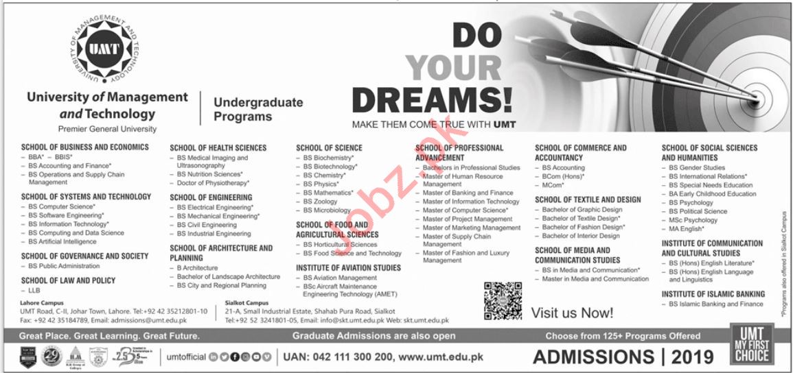University of Management & Technology UMT Lahore, Pakistan are started admissions fall 2019 for the classes of DPT, BS, BBA, MS, MBA, ADCP, M Sc, M Phil, PhD, Pharm D, DVM. Read newspaper ad for exact details.