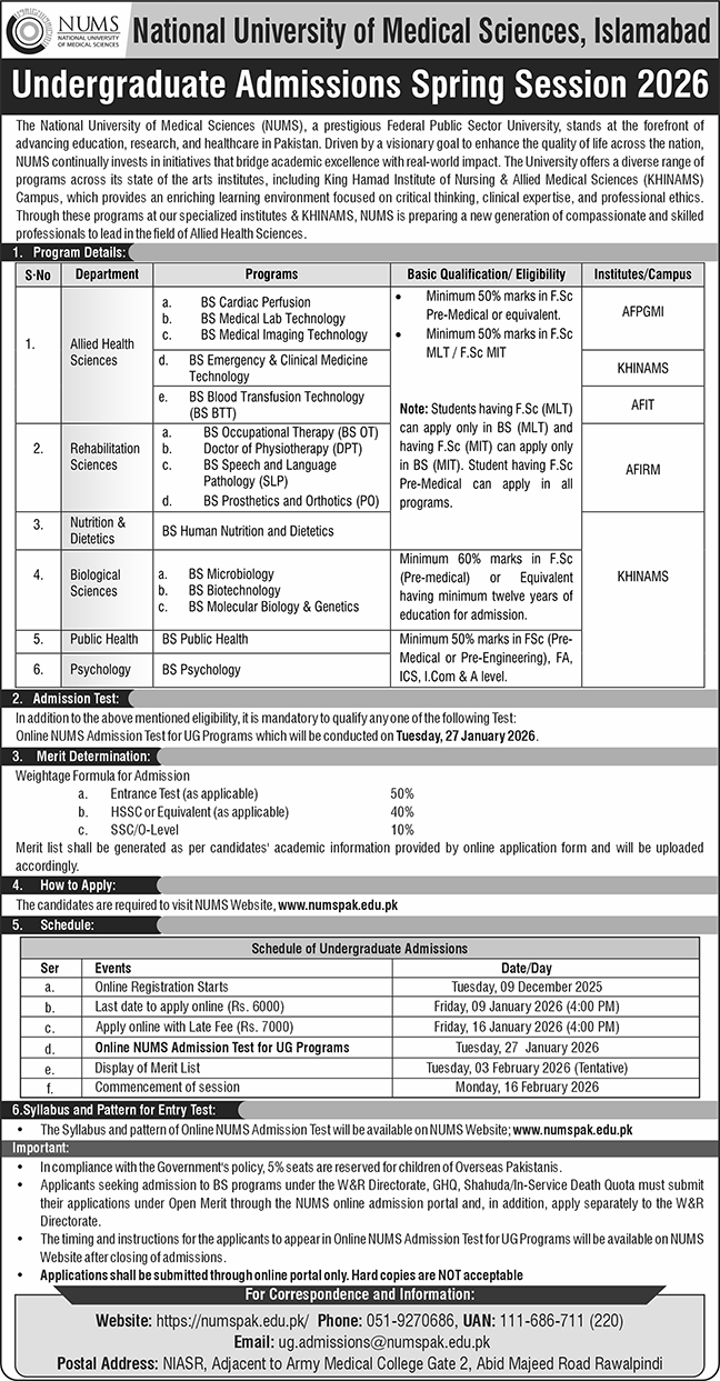 National University of Medical Sciences NUMS admissions 2025 for Undergraduate has been announced. Students can enroll for admissions in National University of Medical Sciences NUMS Islamabad Islamabad Pakistan for academic year 2025 to continue campus based or online education in Science University. Students who want to enroll for academic session 2025 in qualification and admission criteria for Government institute can apply till last date. Read newspaper ad for exact details.