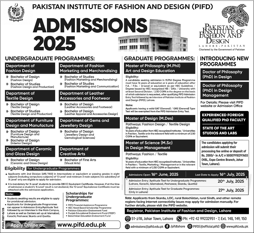 Undergraduate Admissions 2025 open in PIFD