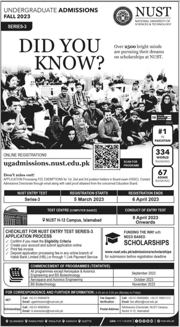 National University of Sciences & Technology NUST has announced admissions 2023 for Undergraduate Admissions. Students can enroll for admissions in National University of Sciences & Technology NUST Islamabad Islamabad Pakistan for academic year 2023 to continue campus based or online education in Science University. Students for admissions in BS and Bachelor can apply for online or campus classes as per Government institute criteria till admission closing date April 6, 2023. Read newspaper ad for exact details.