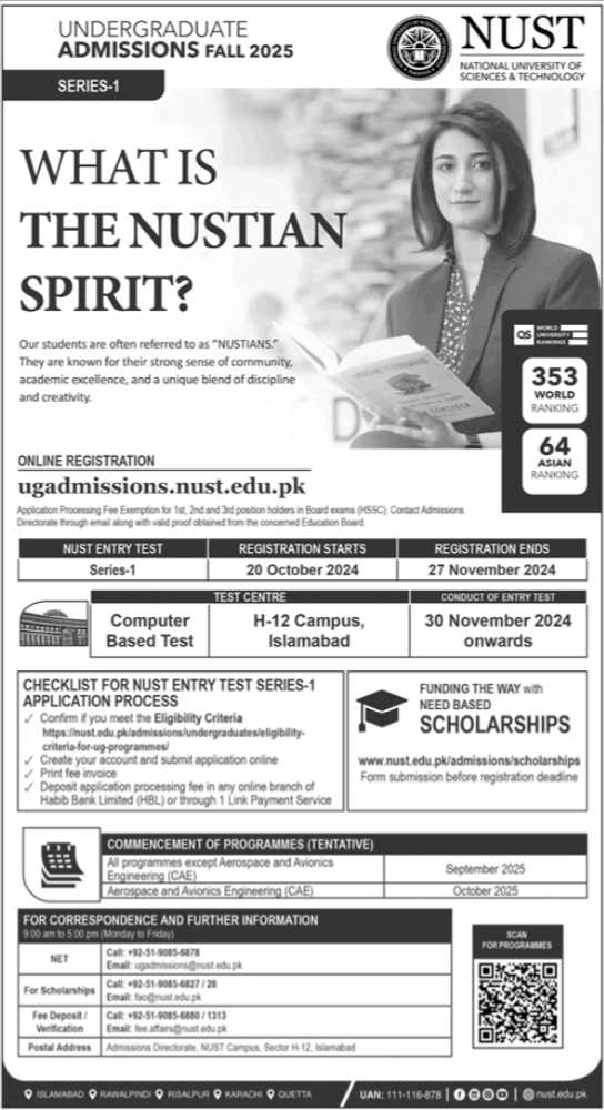 National University of Sciences & Technology NUST admissions 2024 for Undergraduate Programs has been announced. Eligible students can apply for academic admissions 2024 in National University of Sciences & Technology NUST Islamabad Islamabad Pakistan for Science University. Students for admissions in BS and Bachelor & criteria can apply as per Government institute admission policy 2024 before closing date November 27, 2024 as per advertisement. Read newspaper ad for exact details.