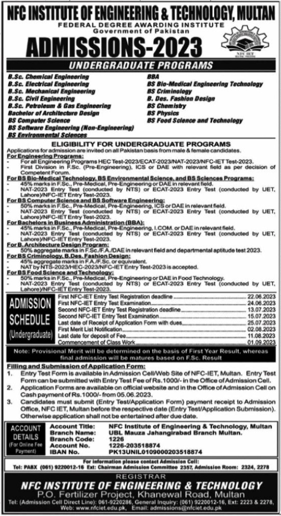 NFC Institute of Engineering & Technology BSc, BSCS,, BS admissions 2023 has been started. Students who want to take admissions in NFC Institute of Engineering & Technology Multan Punjab Pakistan for academic year 2023 to continue education in Science University can apply. Students for admissions in Bachelor, B.E, BS and BCS & criteria can apply as per Government institute admission policy 2023 before closing date June 25, 2023 as per advertisement. Read newspaper ad for exact details.