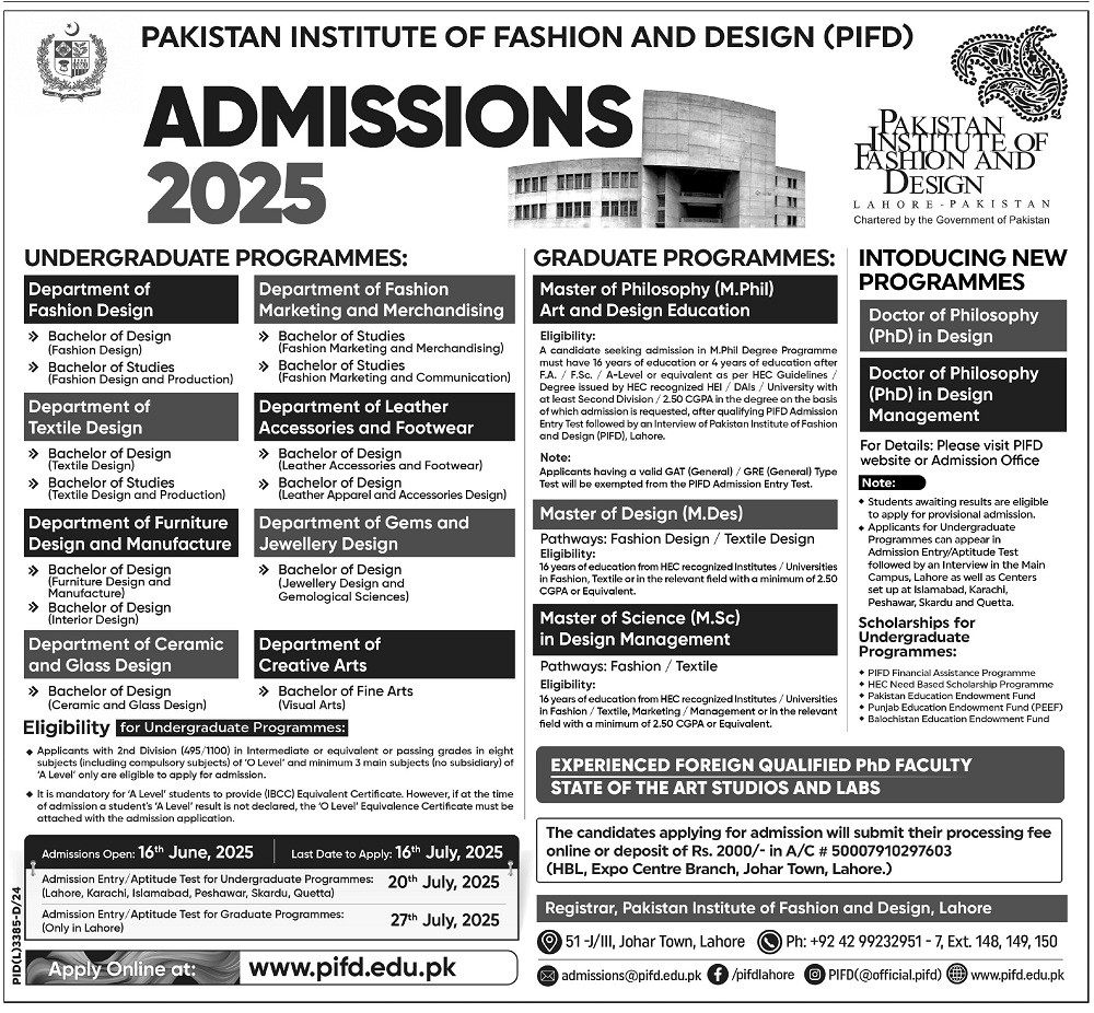Pakistan Institute of Fashion and Design PIFD has announced admissions 2025 for Undergraduate Programmes. Students who want to take admissions in Pakistan Institute of Fashion and Design PIFD Karachi Sindh Pakistan for academic year 2025 to continue education in Business University can apply. Students who want to enroll for academic session 2025 in qualification and admission criteria for Government institute can apply till last date. Read newspaper ad for exact details.