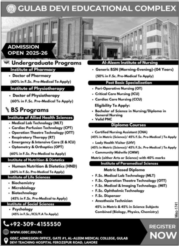 Gulab Devi Educational Complex GDEC admissions 2025 for Undergraduate Programs has been announced. Gulab Devi Educational Complex GDEC Lahore Punjab Pakistan welcomes students to apply for admissions in academic year 2025 in Science University. Eligible students for fulfilling criteria for admissions in can enroll as per Government admission policy 2025 till closing date. Read newspaper ad for exact details.