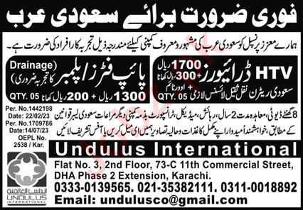 Undulus International invites applications for job positions advertised in daily Express dated 16 July 2023 for following vacancies in Riyadh, riyadh Saudi Arabia.