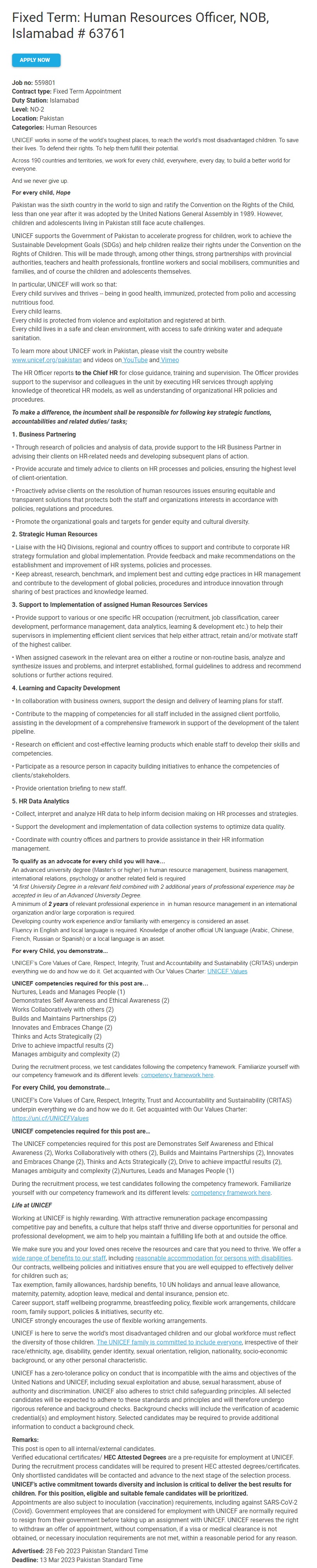 Original Source: https://jobs.unicef.org/en-us/job/559801/fixed-term-human-resources-officer-nob-islamabad-63761