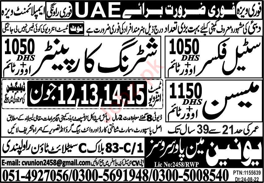Vacant posts including mason, steel fixer and shuttering carpenter are announced in Union Manpower Services Abu Dhabi, dubai UAE as per 11 June 2023 advertisement in daily Express Newspaper. Candidates with Primary, Middle and Matric etc. educational background will be preferred.